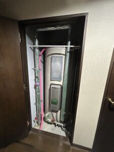 → 配管や配線を安全に取り外し、古い温水器を撤去。通常の方法では配管が錆びてしまって水抜きが出来なかったので配管を切って水抜きしました。