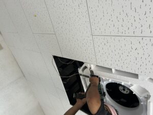 整備スペースや接客スペースの快適性を保つために、しっかりと設置と点検を行いましたので、その様子をご紹介します。
